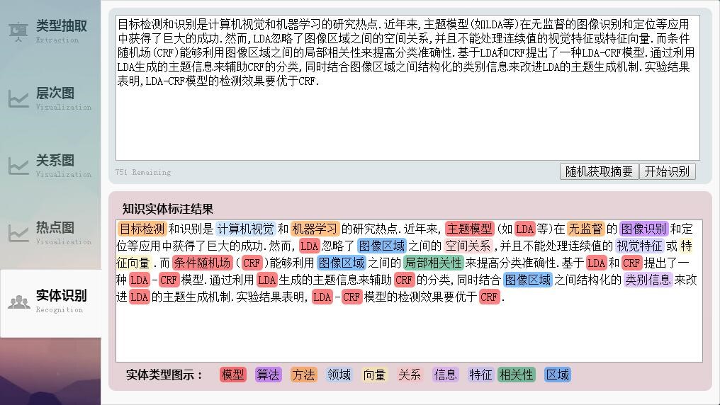 知识实体识别及类型标注的界面如图3所示,用户可以在上侧输入框输入想要进行识别的文本或者点击“随机获取摘要”按钮获取文献摘要进行测试。点击开始识别按钮后,在下侧可以看到知识实体的类型标注结果,结果中不同的颜色背景代表不同的类型,在最下方有对应颜色的类型图示。例如,从图5可以清晰的看到,“条件随机场”、“LDA”、“CRF”等都能识别出来并类型标注为“模型”,而“目标检测”、“机器学习”等标注为“方法”。