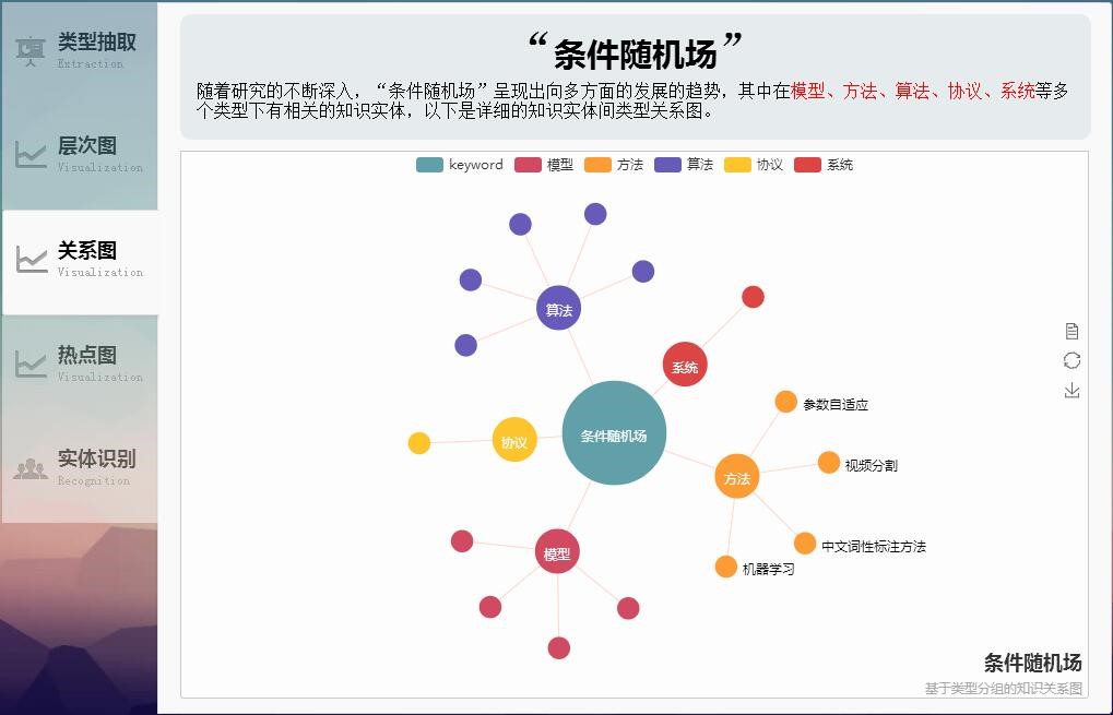 知识实体关系图分别包括层次树图、知识关系图及时序热点图三部分。其中,图2展示的是基于类型分组的知识关系图的可视化界面,从图中可以看到,用户输入关键词“条件随机场”检索后,获得以“条件随机场”为中心的不同类型分组下的知识关系图,包括有模型、方法、算法、协议、系统等多个类型下的知识点。例如,与“条件随机场”相关的“方法”有:“视频分割方法”、“中文词性标注方法”、“机器学习方法”等。